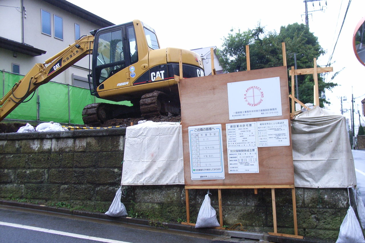 T3世帯住宅工事は着工しました まずは 建築確認済みの表示 そして設計事務所の看板を出し 己れの責任を明示します